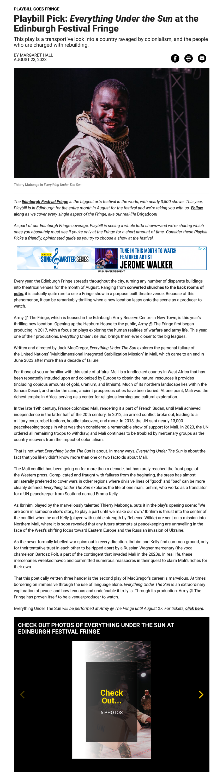 Profile of my production of Everything Under the Sun at 2023 Edinburgh Festival Fringe, as part of Playbill's Picks of the Fringe "A producer to watch"