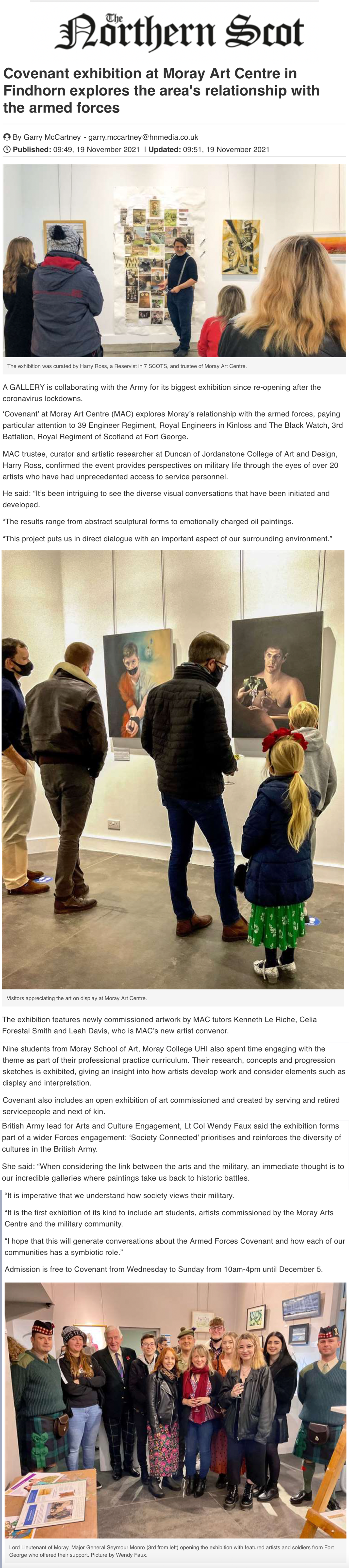Coverage of Covenant, an exhibition I curated at Moray Art Centre, in collaboration with the British Army and Moray School of Art.